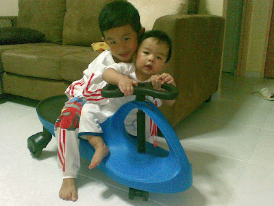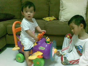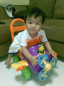 Well well, since Alsten is sitting more steadily now, decided to let him ride on a 'plane'. A toy plane actually, used to belong to Ayden, at least things can be shared between the 2 brothers. That's the good thing about having 2 boys, they can share everything! I don't have to purposely buy something separate.. kinda save $... So happy on his 'plane'