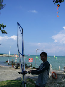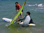 Kelly, the Pro, fixing up the sail. He's got lotsa equipments and it cost so much!